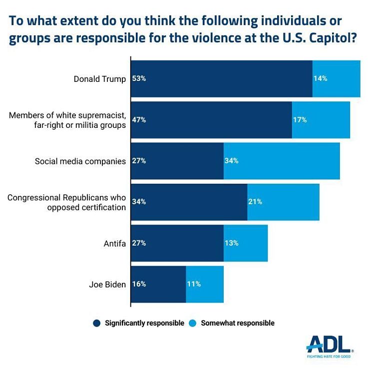 - Approximately two-thirds of these Americans believe Donald Trump (67%) and members of white supremacist, far-right or militia groups (such as the Proud Boys and Oath Keepers) are each at least somewhat responsible for the violence at the Capitol.